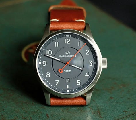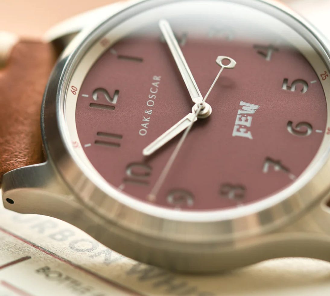 Chase Fancher, weary of corporate life, sought a more fulfilling path. Oak & Oscar, named after his love of whiskey (oak barrels) and his beloved dog (Oscar), emerged as his dream realized. The first watch, the Burnham, became a testament to Chase's meticulous attention to detail, featuring a unique slashed "7" and a hand-crafted "8" that took over 40 hours to develop. The slashed 7 was something that particularly stuck out to me as it’s the same way my own father taught me to do my 7’s. It’s also not a style that you see very often in this day of keyboards and digital screens. I love this deign aspect!